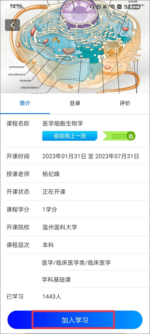 3、知悉课程的名称、目录以及评价等相关信息,待了解完毕后,点击下方的“加入学习”功能按钮。