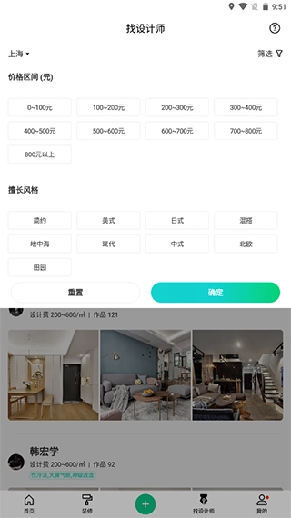 2、然后按照地区、价格、装修风格来进行寻找设计师