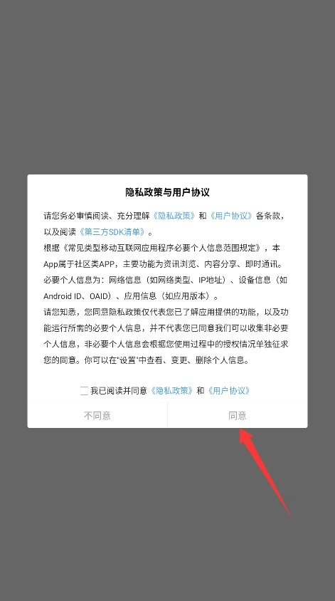 1首次使用时,需阅读平台服务条款及隐私政策,确认无误后点击“同意”按钮方可进入应用。