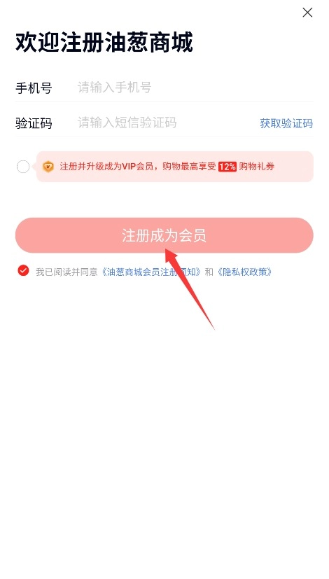 3、填写手机号并获取验证码,输入验证信息后勾选协议,点击注册成为会员即可。