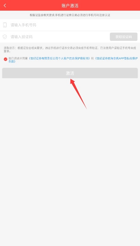 2、输入手机号获取验证码,填写验证信息并勾选同意选项,点击激活完成账号注册。