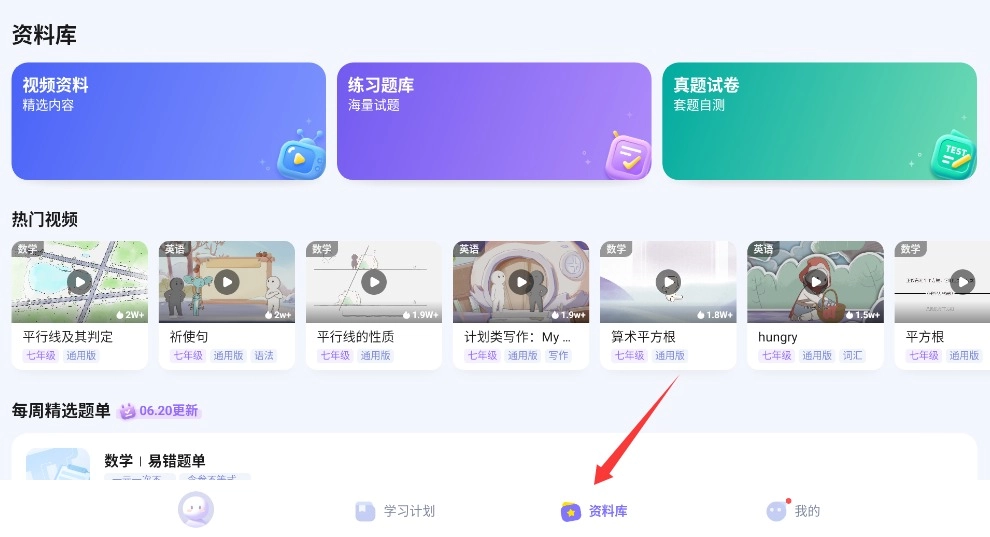 3、进入资料库,可选择视频资料、练习题库、真题试卷进行学习。