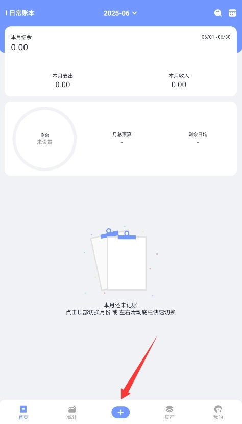 2、进入首页界面后点击底部中央的加号图标,即可开始创建新的记账记录。
