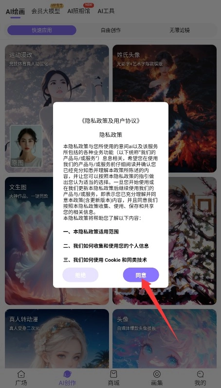 1首次使用时,需仔细阅读平台服务条款以及隐私政策,确认无误后,点击同意按钮方可进入应用。