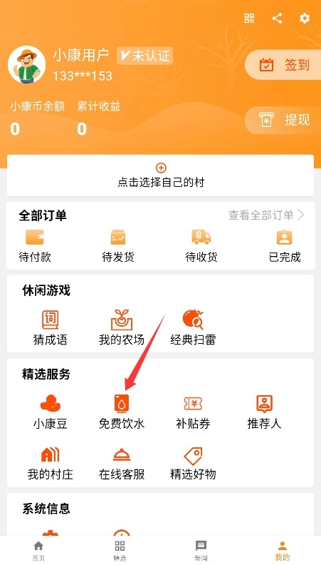 2、进入个人中心页面,在服务列表中找到"免费饮水"功能并点击进入操作界面。