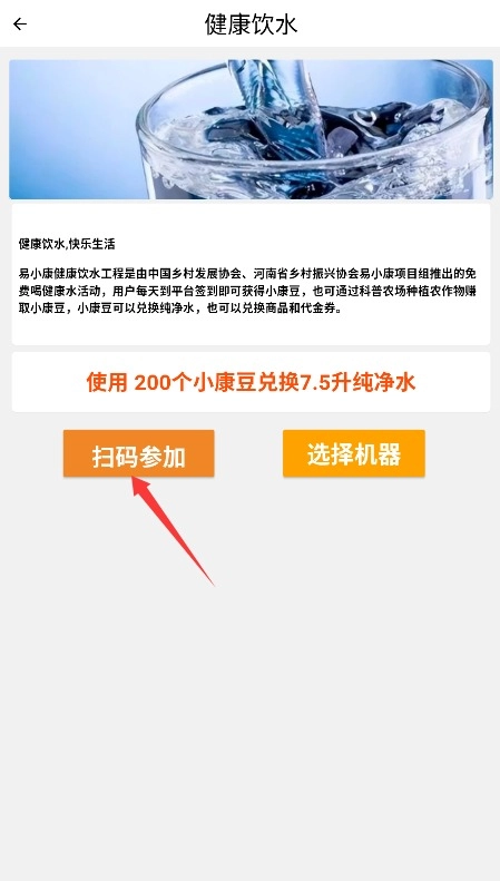 3、选择"扫码参加"功能,使用手机扫描饮水机上的专属二维码即可完成取水操作。