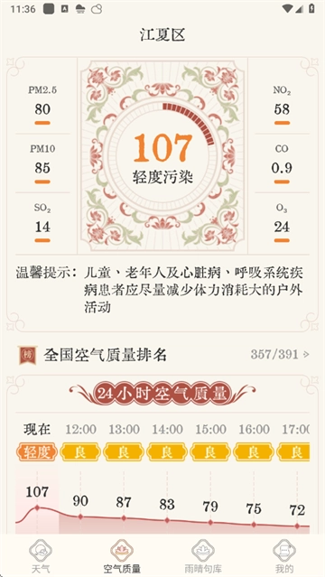 4、雨晴天气预报还“空气质量”板块,让用户能够了解实时的空气状况。