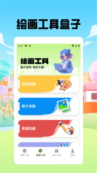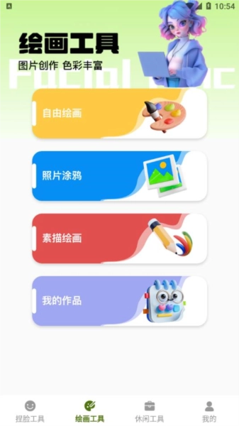 4、集合捏脸、绘画、休闲等多元工具,满足创意与娱乐需求,涵盖精美壁纸、搞怪表情包制作、自由绘画等功能。