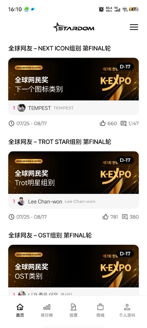 在偶像新专辑发布、年度大奖评选或综艺节目播出等关键时期,StardomApp成为粉丝最主要的应援工具。粉丝可以在这里集中力量,通过投票功能为偶像打榜,助力其获得更好的成绩。