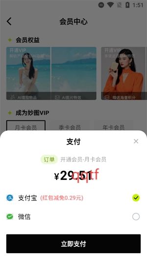 在支付界面选择支付方式,完成支付后解锁会员。