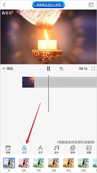 6、点击【滤镜】,可以给视频添加滤镜效果;