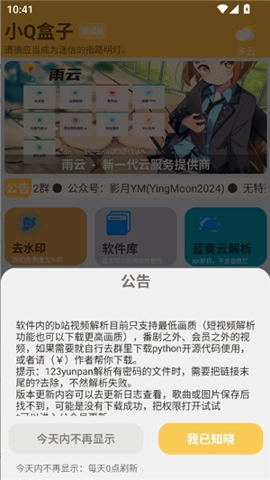 1. 在本页面下载小q盒子app。安装完成后打开该应用,进入首页时,会自动弹出公告,点击“我已知晓”。