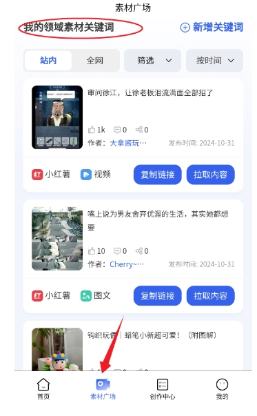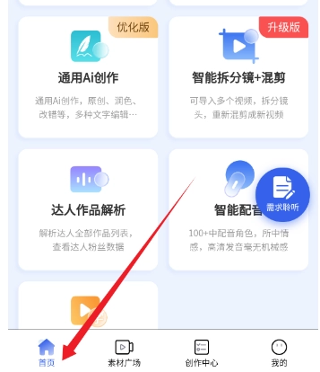 创作工具包含:视频二次创作、AI配音、文案提取等。