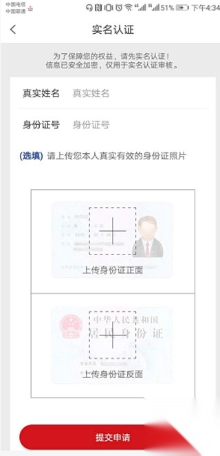 为保证账号的安全性,用户注册成功后若要激活福利工会券和钱包需要用户进行实名认证;用户输入身份证的姓名和身份证号码、身份证正反面提交后则可进行实名认证。