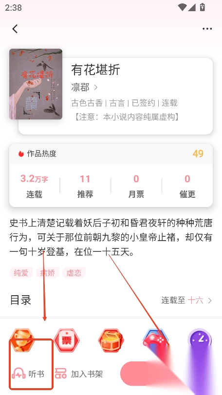 进入喜欢的小说界面,点击立即阅读,可以阅读,点击听书,就可以开始听书啦
