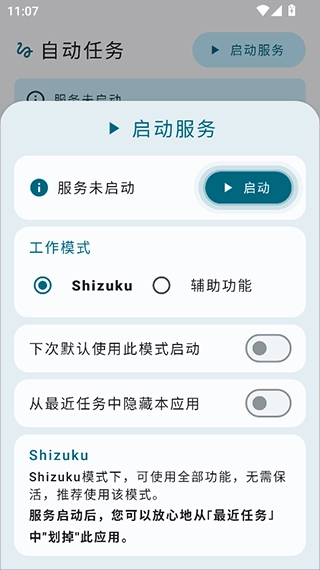 既支持基础的无障碍服务模式,也支持借助Shizuku获取更高权限的高级模式。