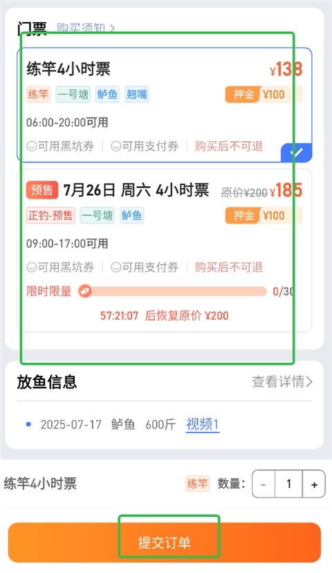 4、于钓点页面搜索到钓点后,进入购买界面,挑选门票,点击提交订单。