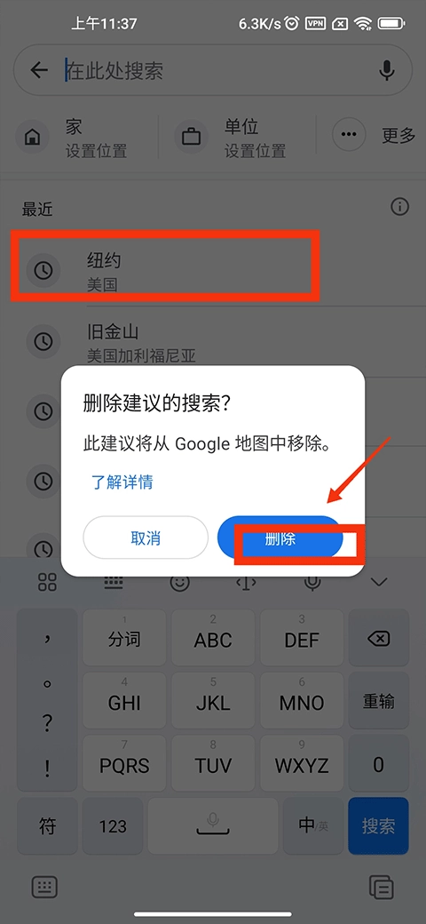 2、接着在最近界面中长按搜索记录,此时会弹出删除搜索的提示,点击删除,就能把该搜索记录删掉。