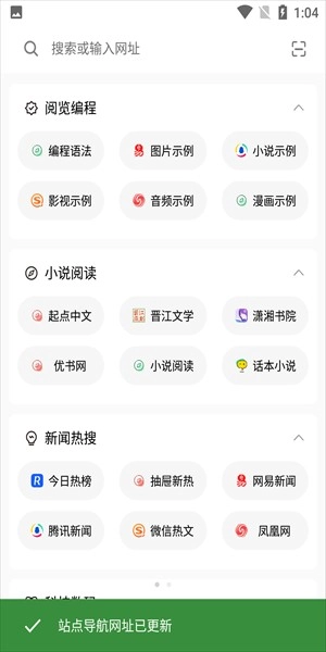 2. 点击网址导航,就能看到编程阅览、小说阅读、新闻热搜、科技数码等内容。