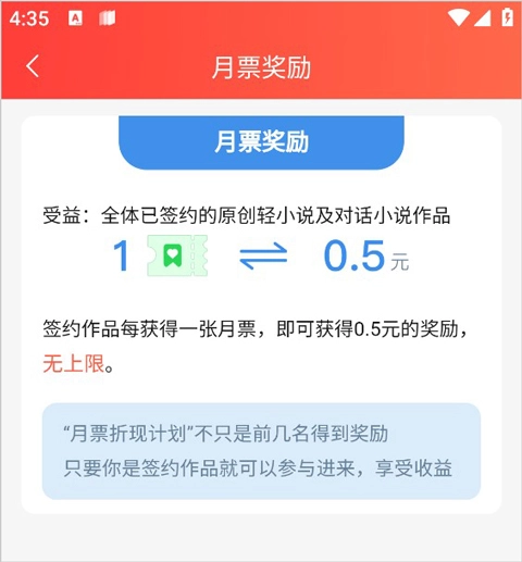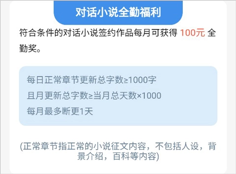 满足条件的对话小说签约作品,每月能够获取100元的全勤奖。