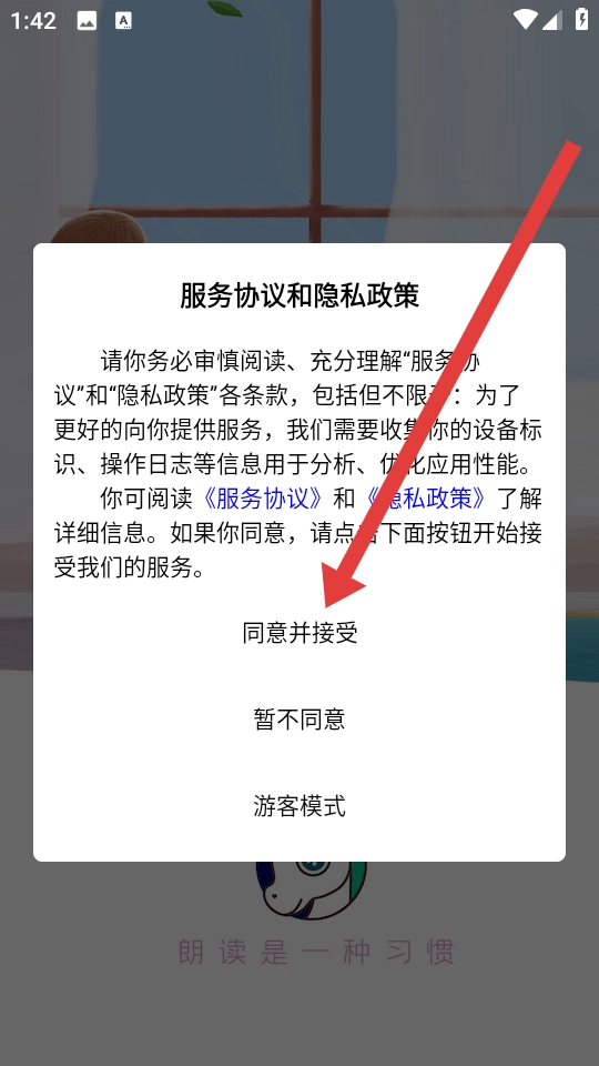 1. 开启小马朗读App,进入应用后会跳出用户协议及隐私政策界面,点击同意并接受。