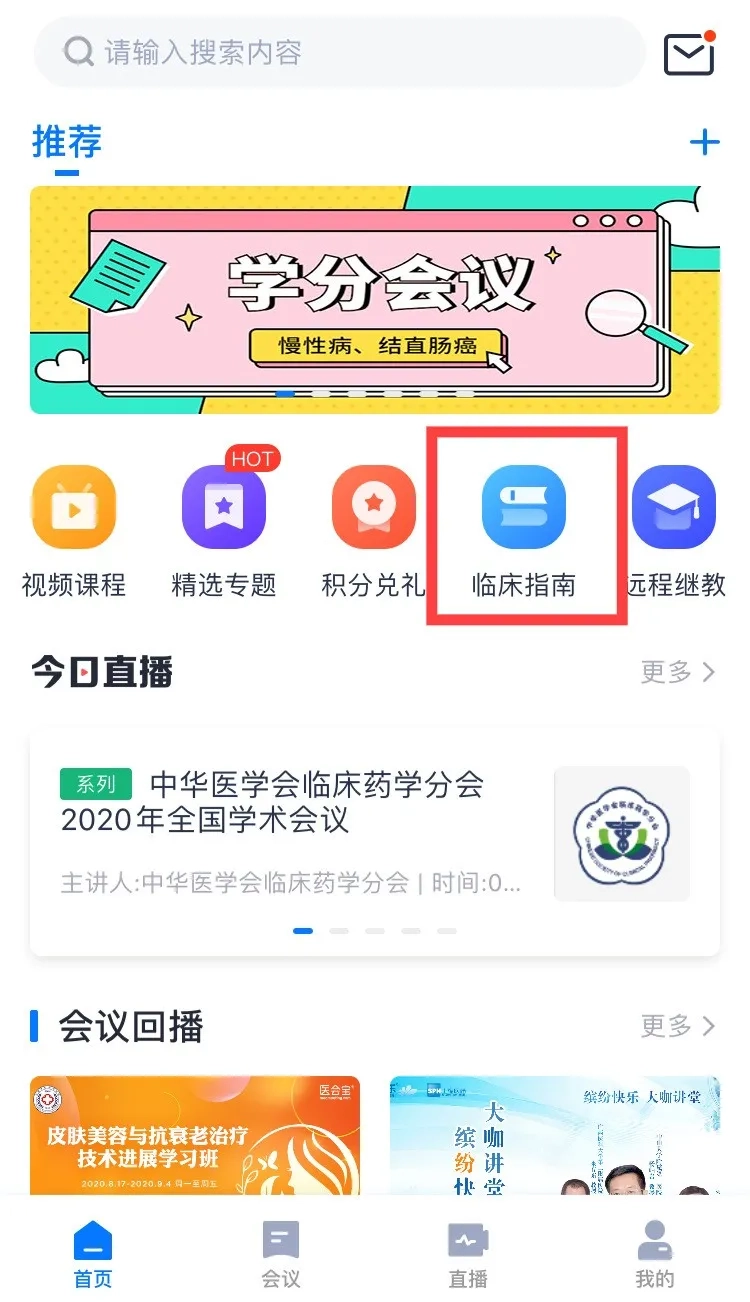 开启医会宝,轻点“首页”-“临床指南”,从而进入临床指南板块。