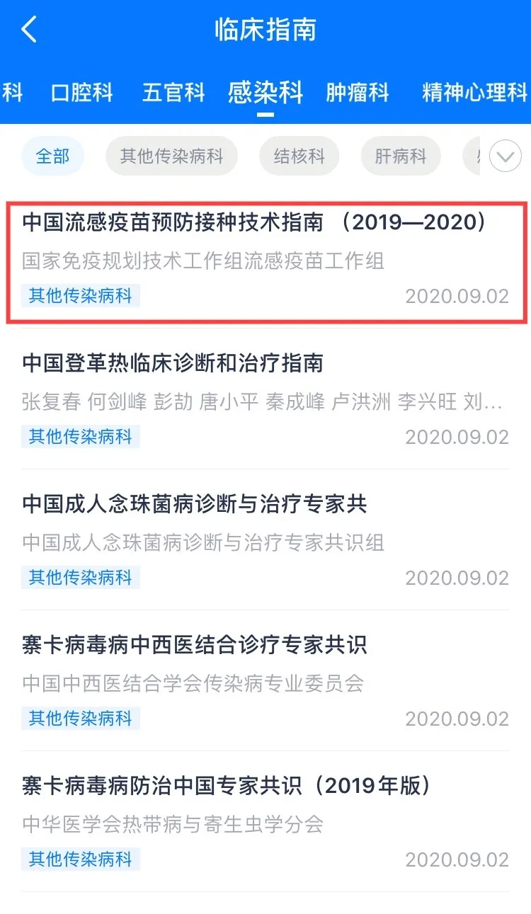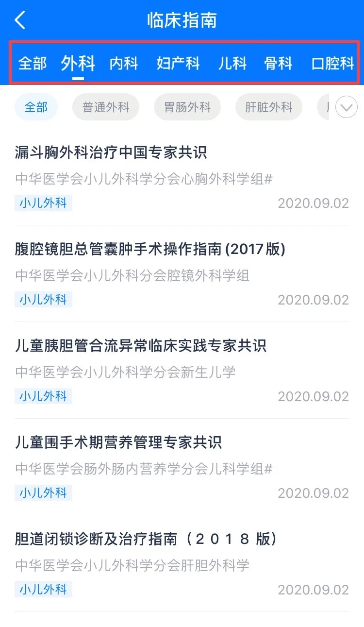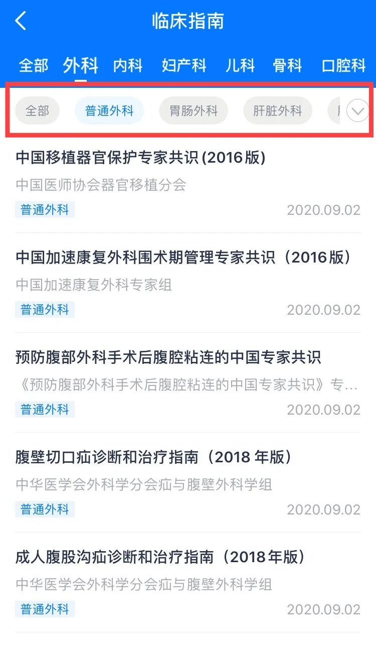 2. 点开临床指南,通过滑动操作查看各个科室。