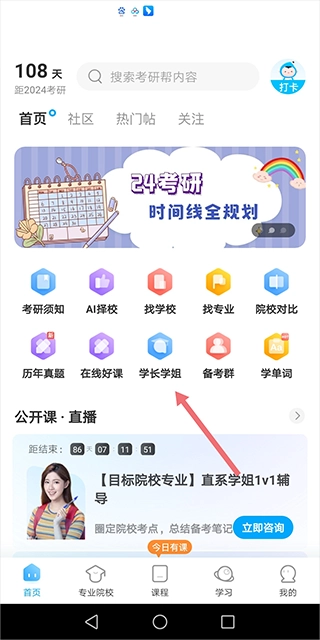 1、在本站安装考研帮,打开进入首页中点击【学长学姐】