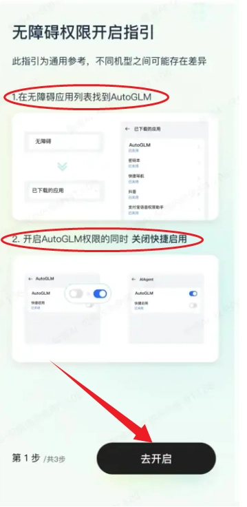 3、登录完毕后根据软件的指引开启无障碍权限,然后在无障碍应用列表找到AutoGLM,开启AutoGLM权限的同时关闭快捷启用.