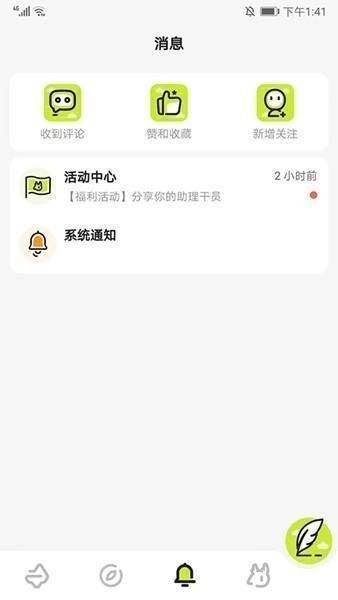 3、进入消息界面,可查看评论、赞、收藏和新增关注的消息提示,