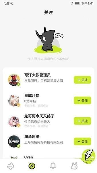 2、进入关注界面,可看到当前关注的用户,也可以选择画师、视频作者、攻略作者等用户关注,
