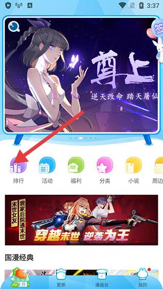 1、漫画台主页功能齐全,顶部展示精彩漫画封面,下方设排行活动福利分类等入口,还有国漫经典推荐,整合小说周边板块,助力用户发现优质漫画。