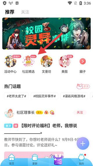 3、漫画台社区页布局丰富,顶部展示特色漫画横幅,下方设活动中心社区精选等入口,热门话题区罗列趣味标签,还有社区理事长动态。