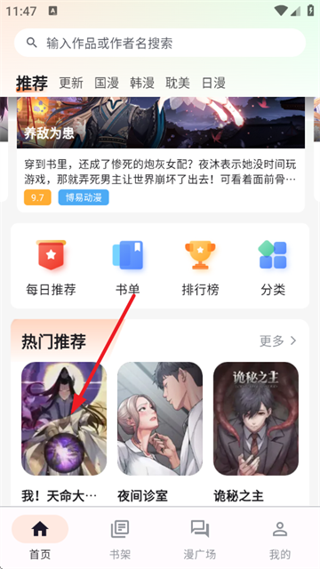 1、进入猫呜漫画,可在首页中点击进入各种官方推荐热门小说、漫画。