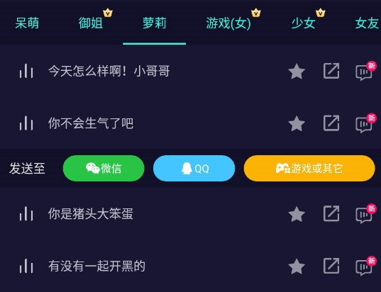 3、选择变声语音或收藏语音中的语音,点击任意一条语音播放试听