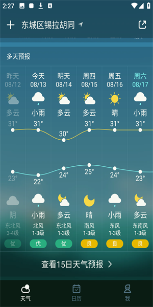 3、下滑到多天预报,点击这里的查看15天天气预报。