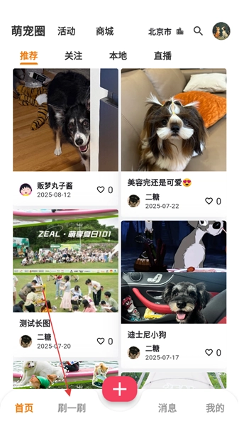 1、打开萌宠社区,点底部【刷一刷】,进入内容页。