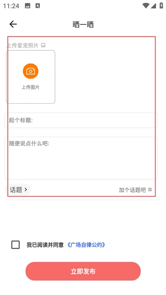 4、进入【晒一晒】页面,依次完成上传照片、填写标题、撰写内容、添加话题等操作,勾选协议后,点击【立即发布】。