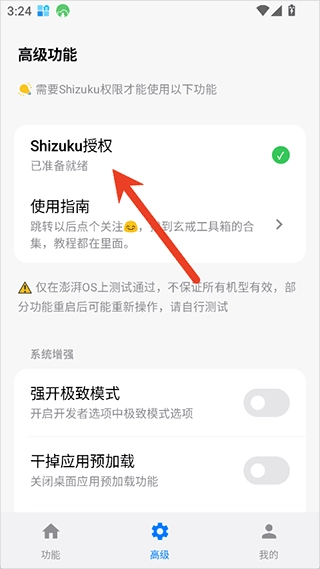 4、当然,在进行授权时,你的Shizuku必须已经激活启动,只有这样你才能直接进行授权使用。授权成功后会显示“已准备就绪”,此时便可以使用高级功能了。