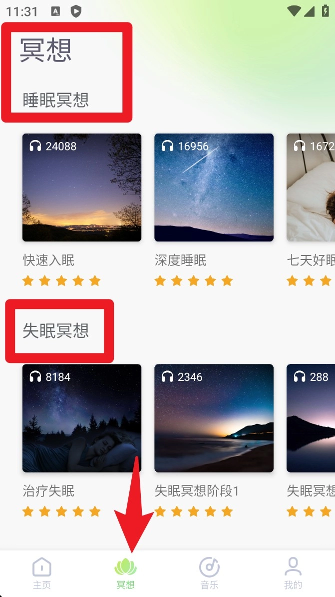 3. 于冥想页面,选中失眠冥想分类后,便能浏览各类睡眠音频。该功能支持分阶段引导,助力入眠,同时提升专注与放松的效果。