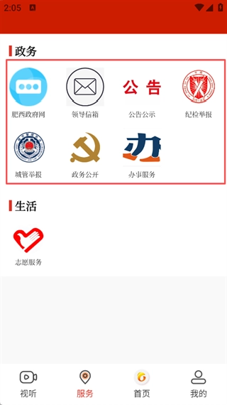 1、打开肥西融媒App,点击【服务】板块。