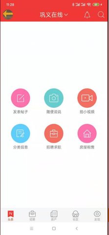 在手机上打开“巩义搜”App,于软件首页右下角直接点击快速发布按钮,便能进入发布类型选择页面。此外,还能在首页挑选不同频道,进入相应频道后进行发布(例如底部菜单中的“招聘”“房产”“社区”等)。