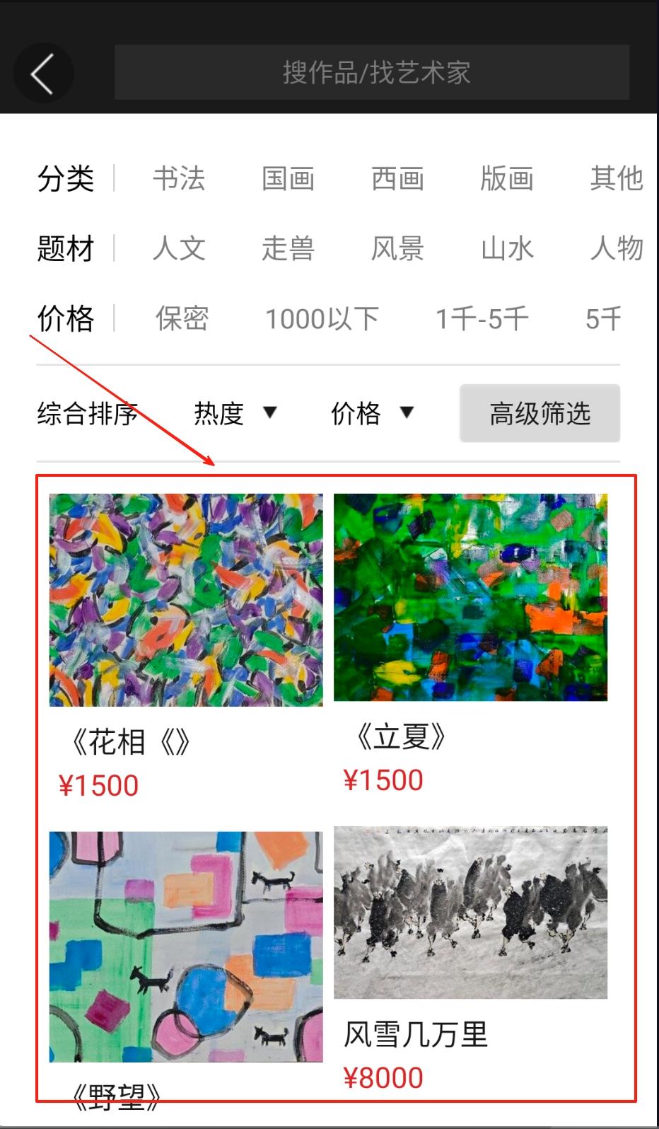 3、进入交易板块浏览艺术品,借助试挂功能查看摆放效果的预览。