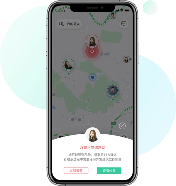 2)一键求助功能,可向紧急联系人发出求助信号,并持续共享当前位置信息;