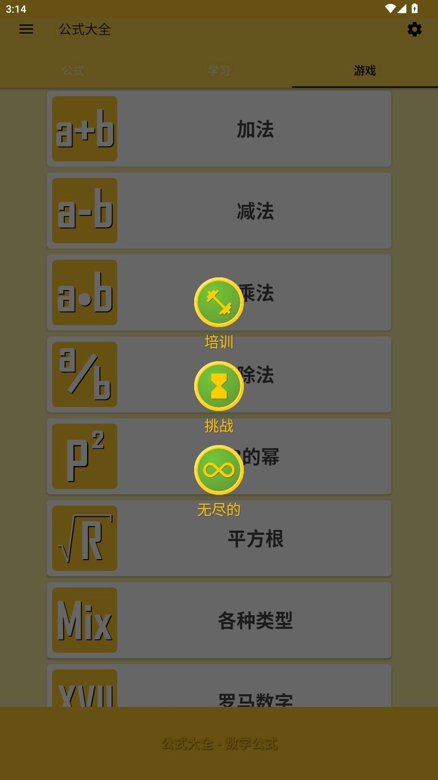 4、游戏模块可通过右上角的齿轮图标调整难度,设有培训、挑战、无尽三种模式,帮助用户提升公式计算能力。