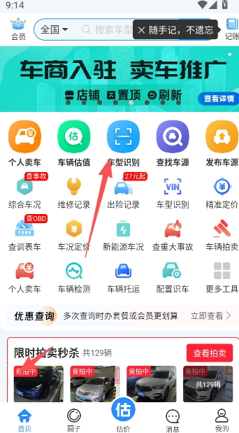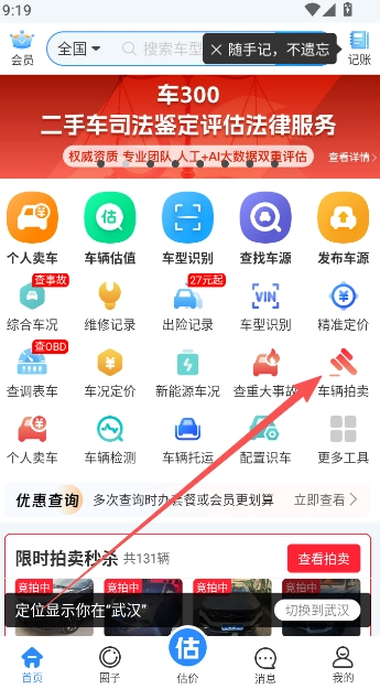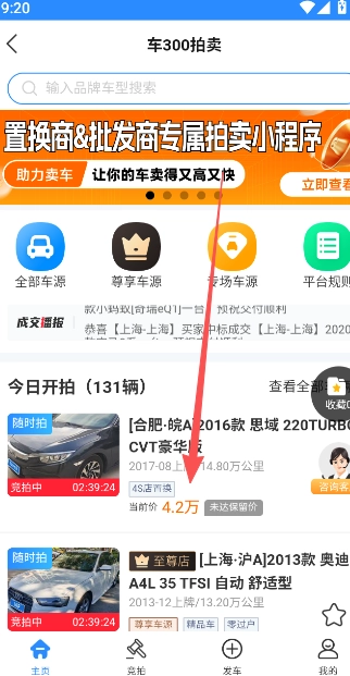 1、在车300专业版首页的功能栏目中点击,即可展示车辆拍卖功能。