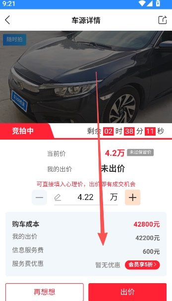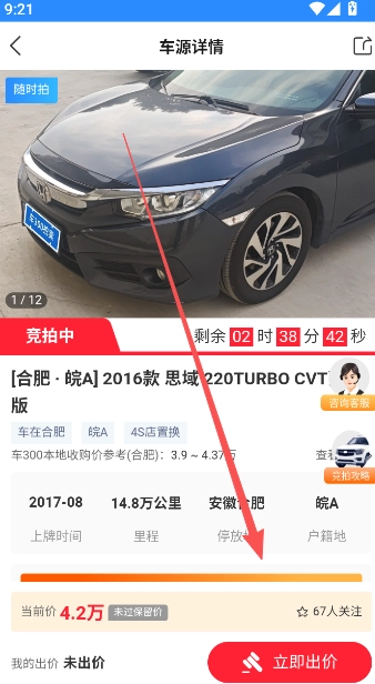 4、在车源详情页面继续出价完成最终竞拍。