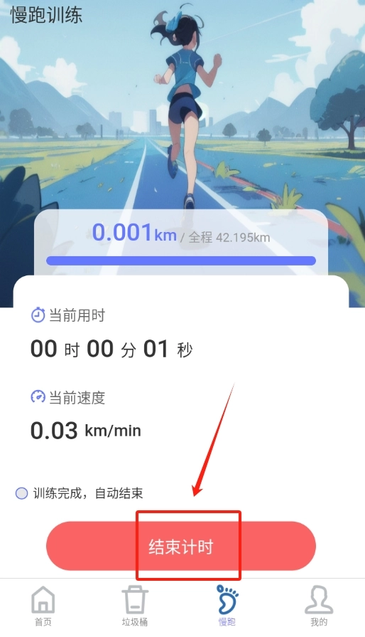 4、慢跑结束后点击结束计时按钮,系统会自动保存这次跑步的里程、时长和消耗的数据。