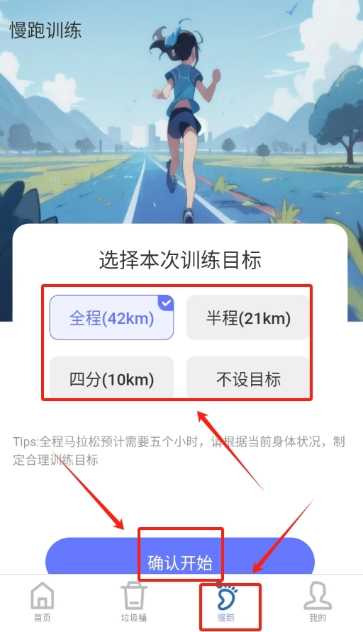 3、切换到慢跑页面,选择适合自己的训练目标(比如距离或者时长),确定后开启慢跑数据记录和计时。