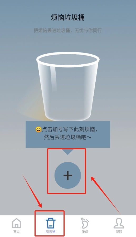 2、进入垃圾桶页面,点击加号按钮输入烦恼内容,完成后一键“丢进垃圾桶”,有效释放压力。